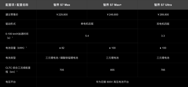 智界 S7,全系纯电,Max 版 22.98 万元,Max+ 版 24.98 万元,Ultra 版 28.98 万元。