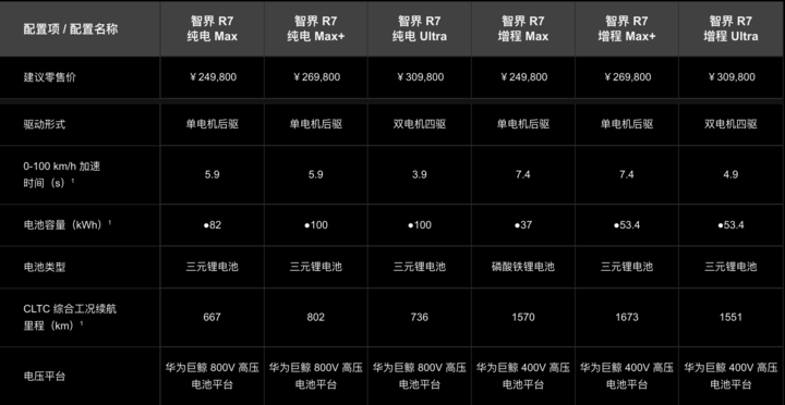 智界 R7,纯电版和增程同价,Max 版 24.98 万元、Max+版 26.98 万元、Ultra 版 30.98 万元。