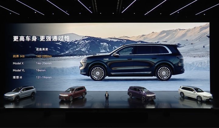 庞大的身躯不仅带来了更强大的气场,也赋予了它出色的通过性。余承东表示,M8 纯电版 700mm 的涉水深度和最高 220mm 的离地间隙,超过了奔驰 GLS 等 SUV 车型。
